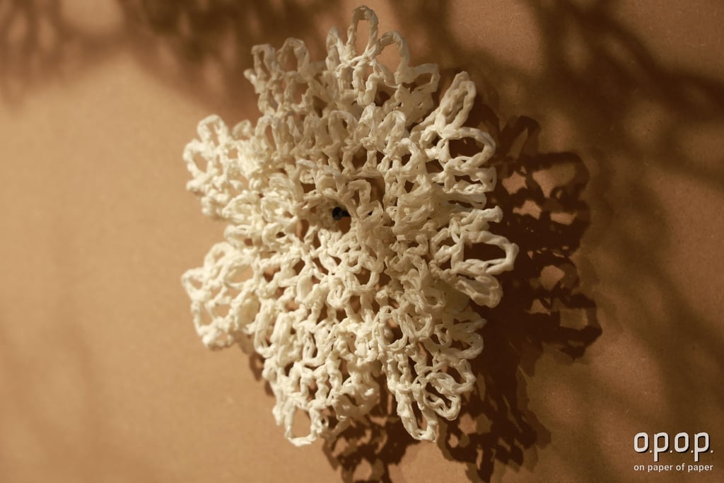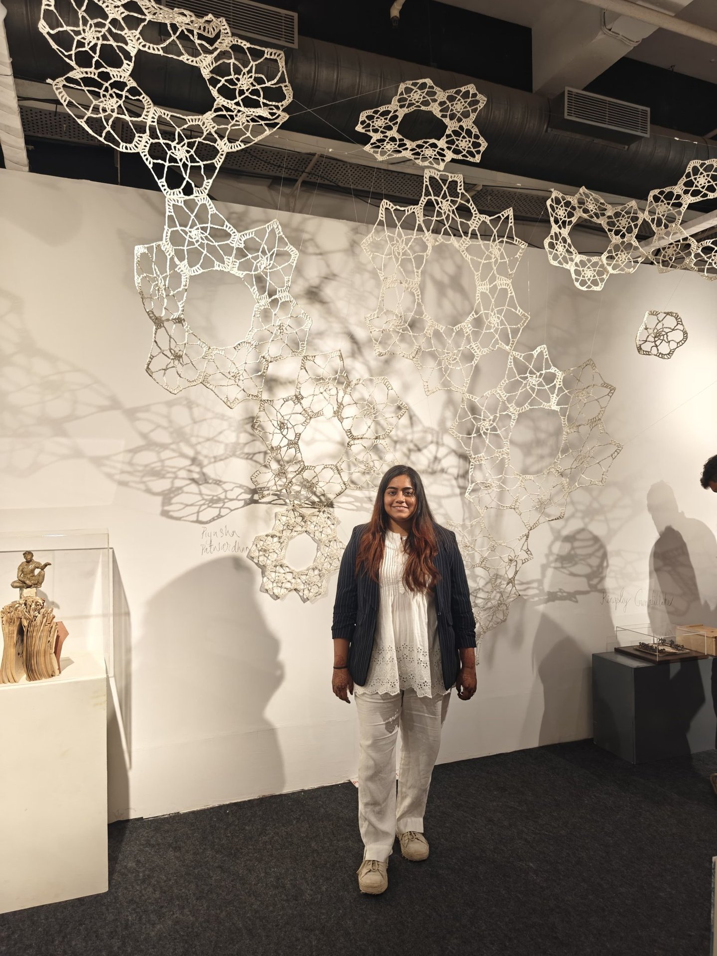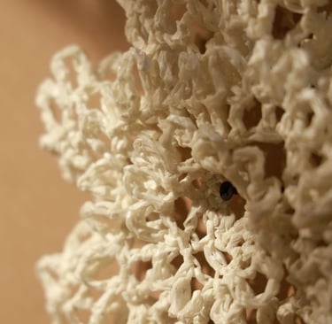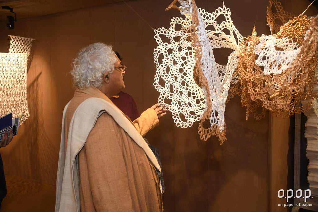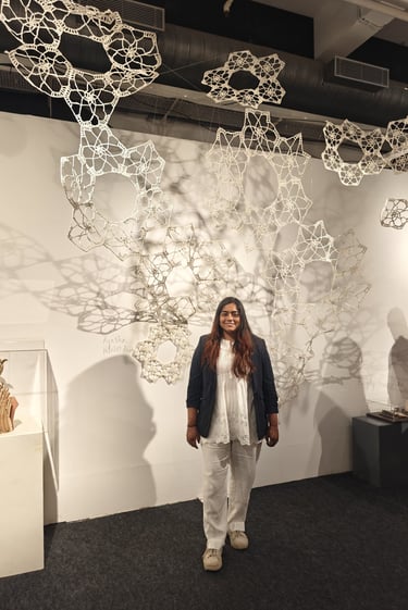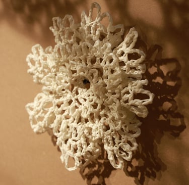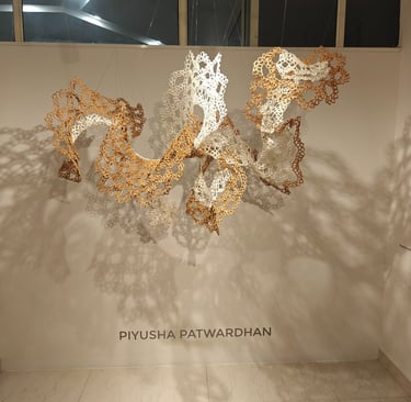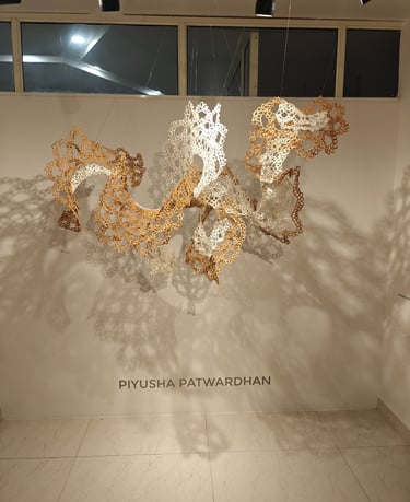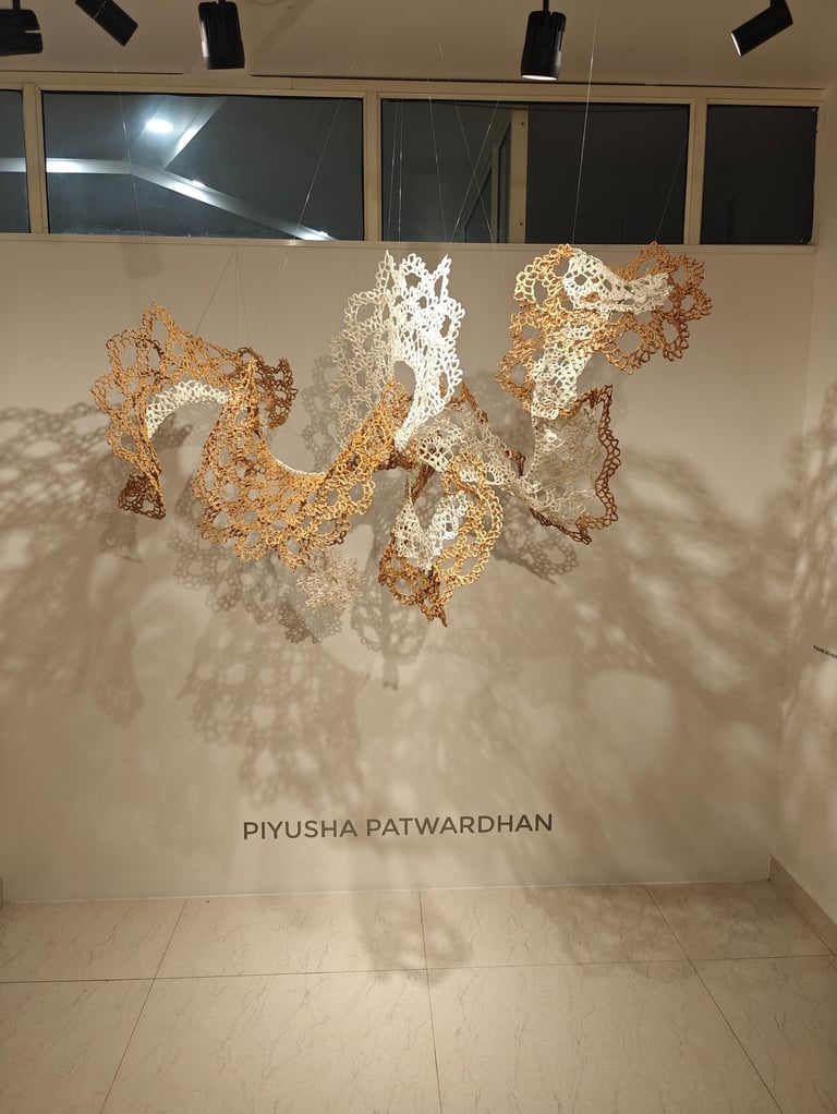 Piyusha is intrigued by the potential narrative these patterns might reveal about the birth of light within the sun. Piyusha illustrates this metaphor through her work, using paper thread to meticulously crochet a similar geometric design that unfolds in a wave-like pattern. Employing dual colors, white symbolizes the formation of light, while brown signifies light touching the terrestrial tapestry. Many such crocheted waves emanate from the गर्भ-स्त्रोत (origin) of the sun to imprint its essence on the earthly canvas.