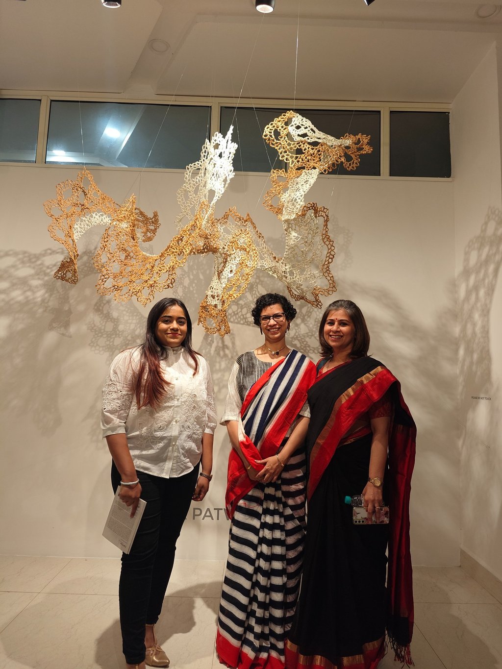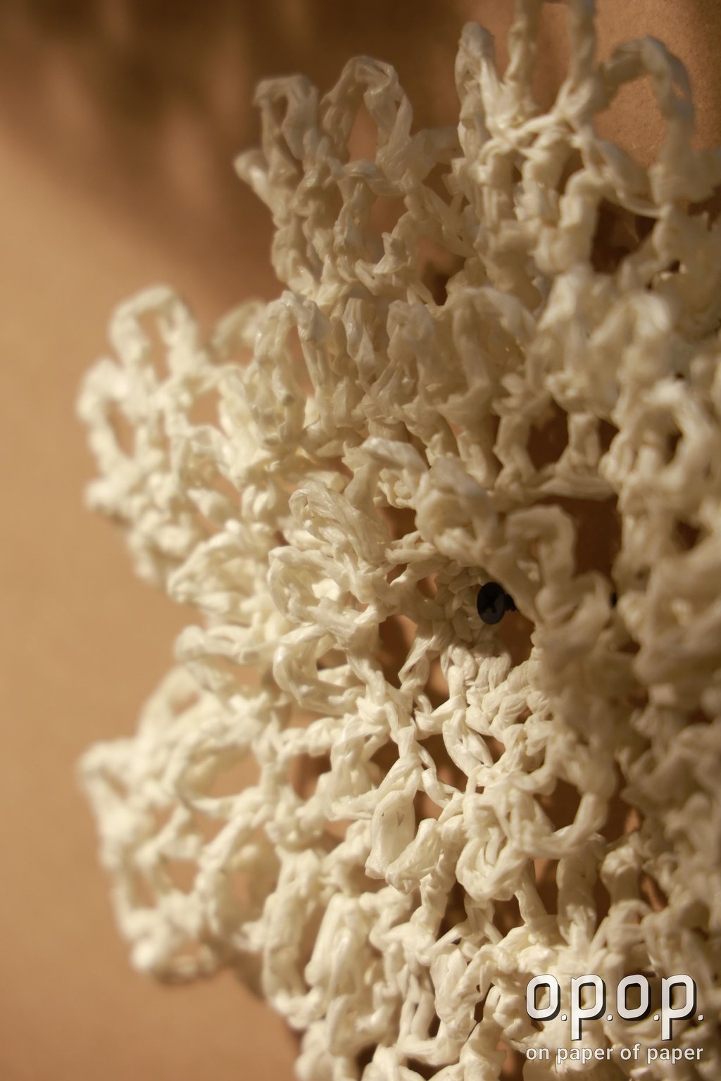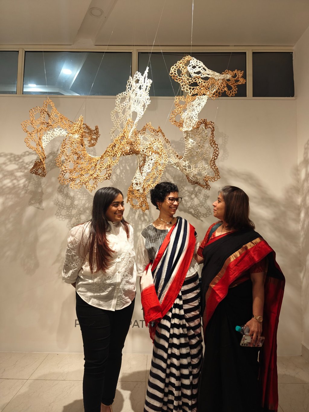 Piyusha is intrigued by the potential narrative these patterns might reveal about the birth of light within the sun. Piyusha illustrates this metaphor through her work, using paper thread to meticulously crochet a similar geometric design that unfolds in a wave-like pattern. Employing dual colors, white symbolizes the formation of light, while brown signifies light touching the terrestrial tapestry. Many such crocheted waves emanate from the गर्भ-स्त्रोत (origin) of the sun to imprint its essence on the earthly canvas.
