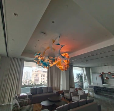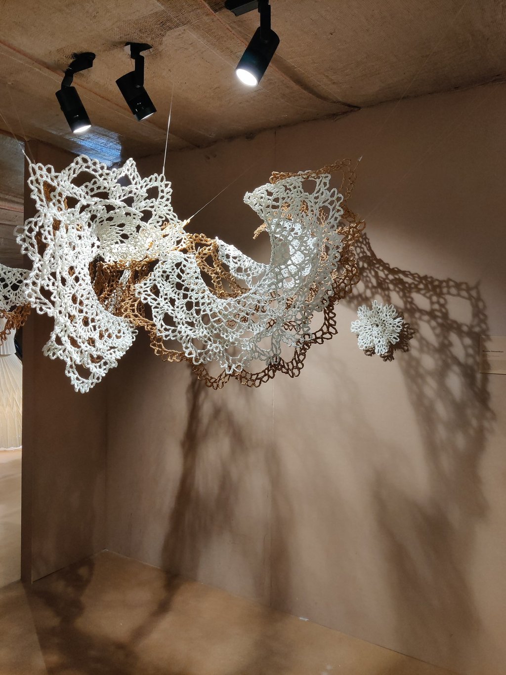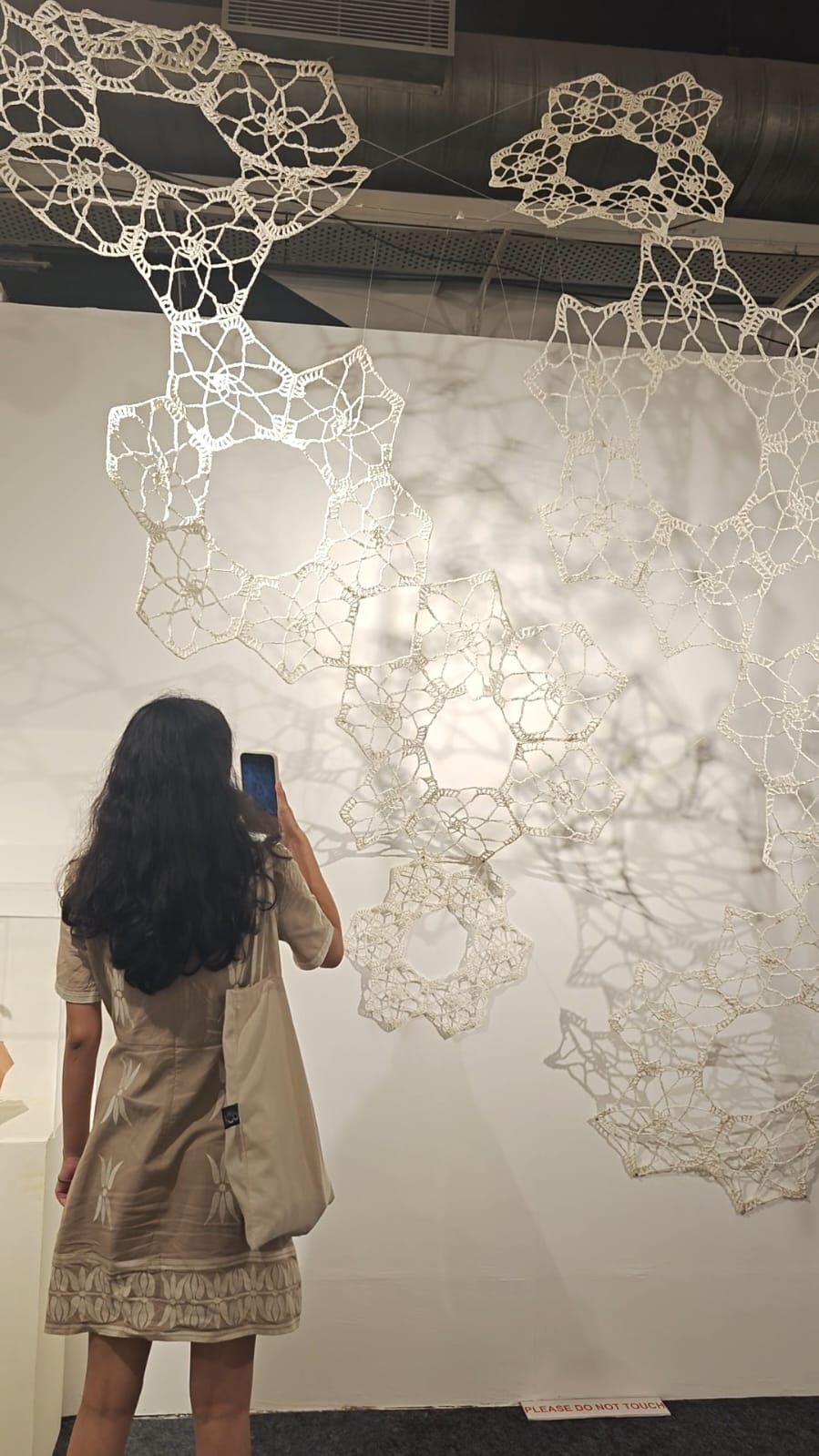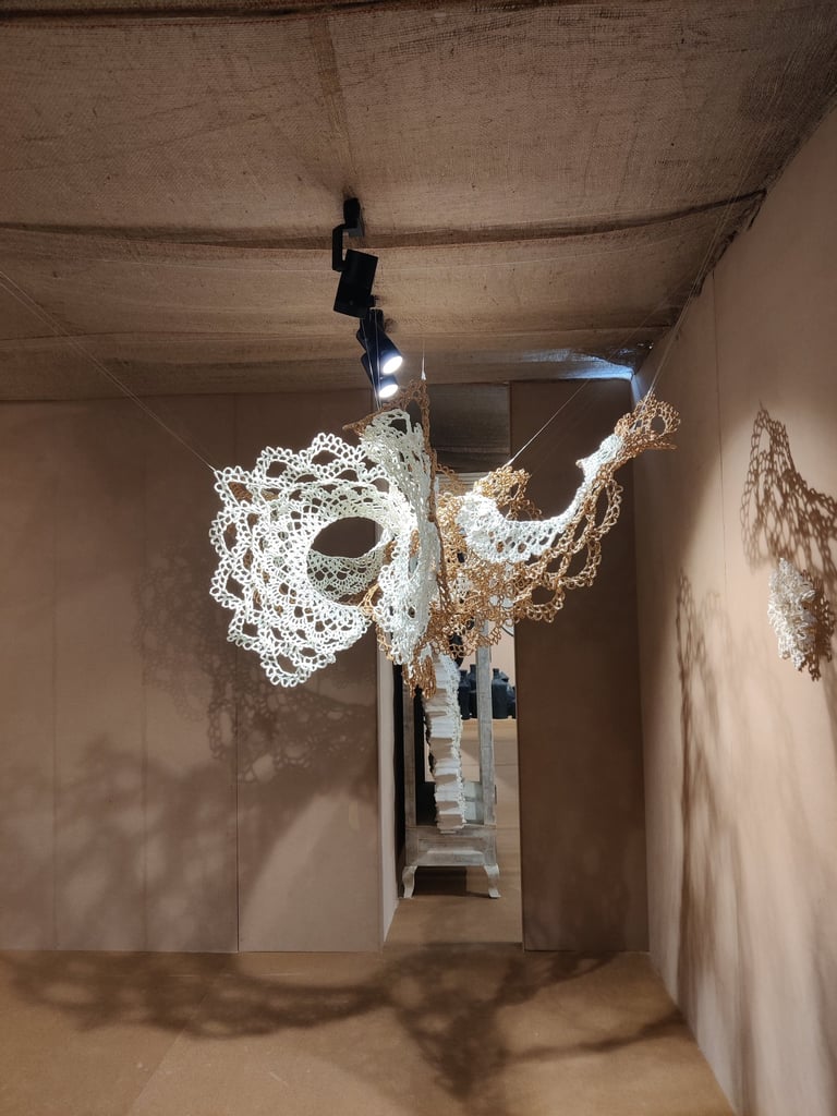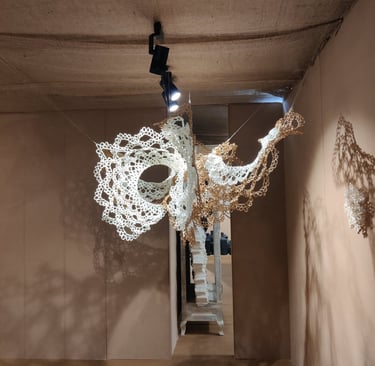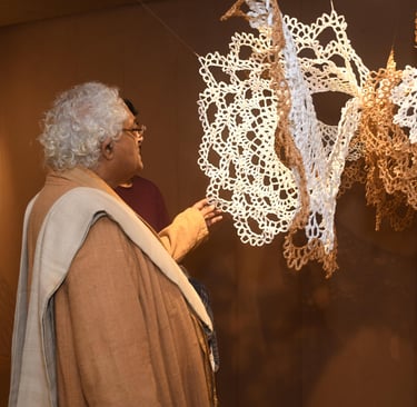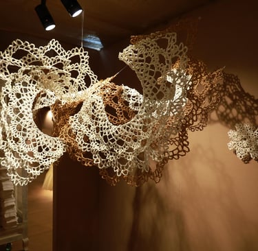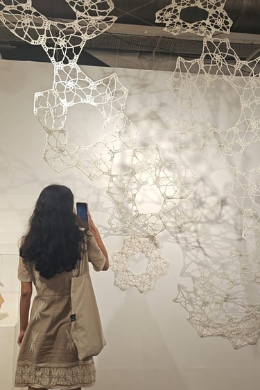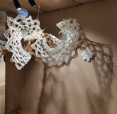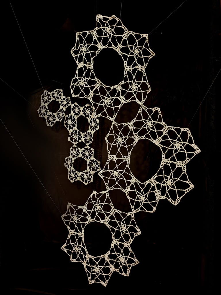 In Taramandal / तारामंडल, each hand-crocheted mandala unfurls like a microcosmic constellation, where every knot serves as a star in its own right. The intricate web of knots within each mandala forms galaxies—celestial gatherings of these stars, suspended in harmony and interconnection. The gaps, the breathing spaces between the mandalas, evoke the profound silence and expansiveness of the universe itself, embodying the cosmic unknown that lies between galaxies.Taramandal is a reminder of humanity’s place within this vastness—how each of us, like a knot, is bound to others in invisible threads, forming galaxies of communities and relationships. The installation invites viewers to experience a reflective journey, contemplating the beauty of connection and the humbling grandeur of the unknown. Like the stars that shine from unimaginable distances, Taramandal is a celebration of both the individual and the collective, anchored in the delicate balance of interstellar wonder.