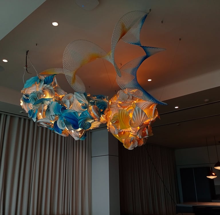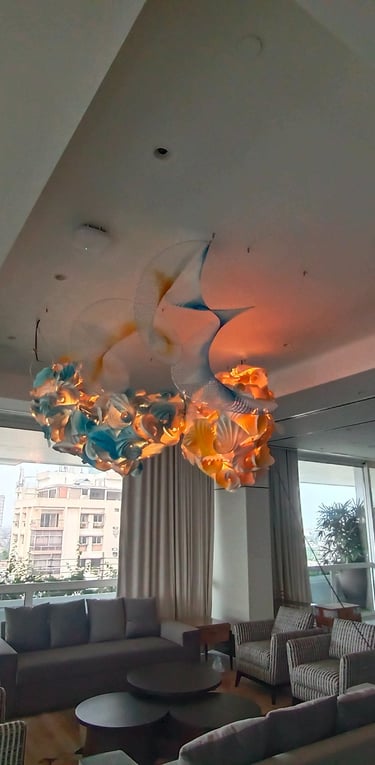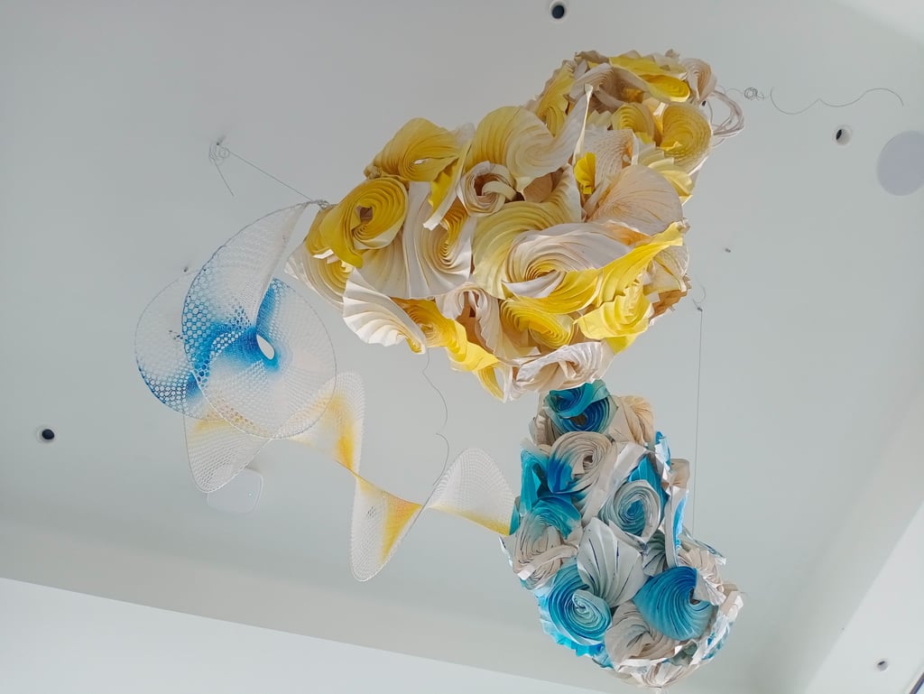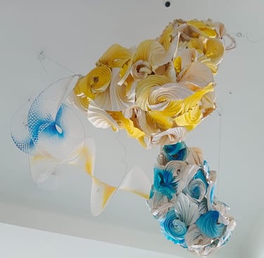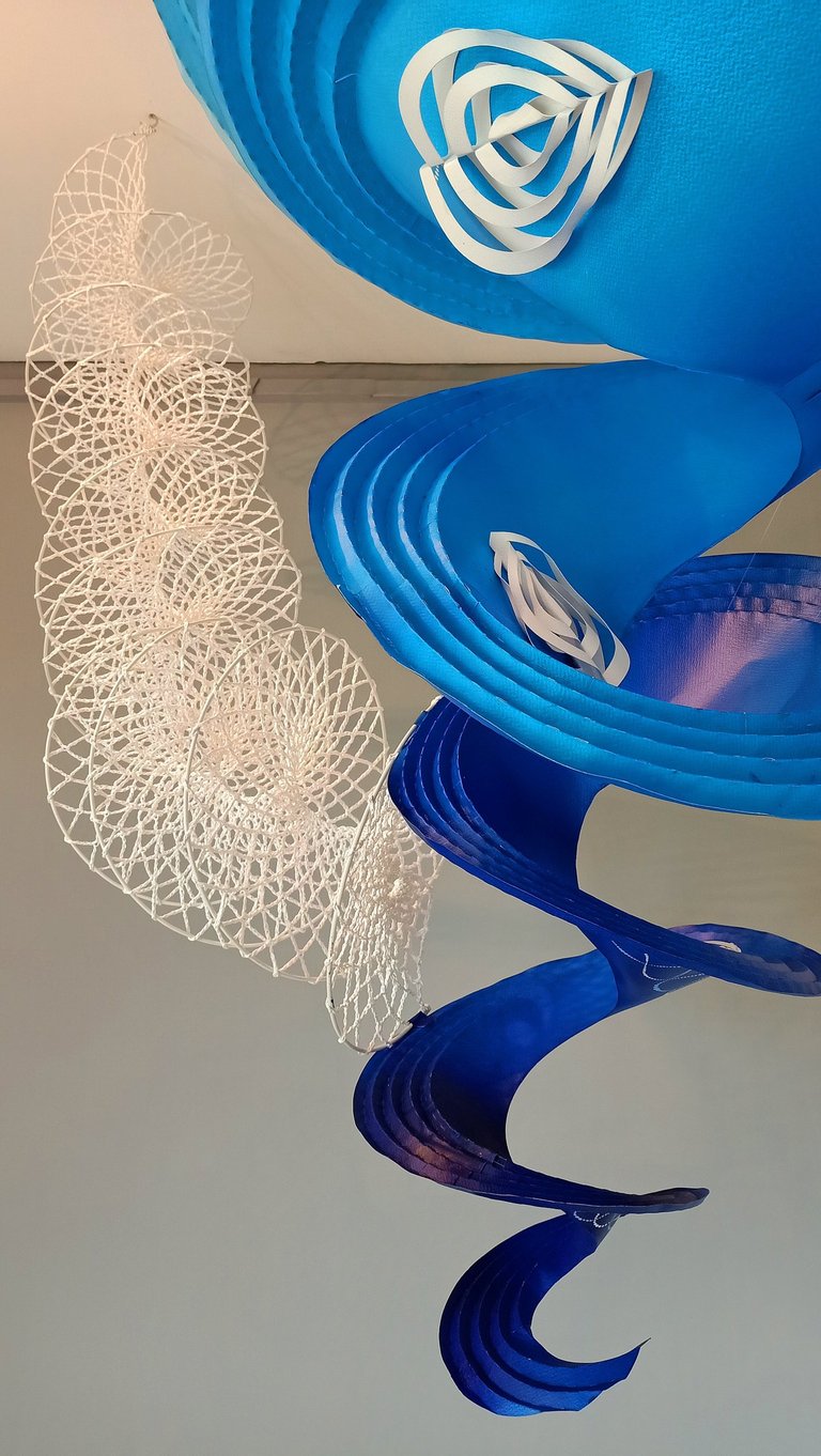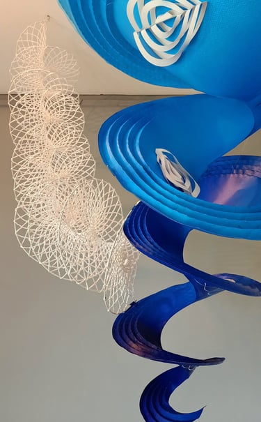 Antara has embraced the Buddhist symbol 'Unalome', which represents the journey of individual transcendence into universal consciousness. She sculpturally represents this symbol through a hand-folded and hand-painted kalmon chain origami spiral, infused with the spiritually significant color blue. This primary form is layered with lotuses, symbolizing steps towards reaching Buddha-hood, and meticulously detailed drawings reflecting the sound frequencies of the Buddhist mantra “Nam Myo Ho Ren Ge Kyo,” embodying the six steps of devotion to the mystic law of the Lotus Sutra. Together, these artists intertwine mantras from two different religious traditions, transcending religion to speak about self-growth and evolution.