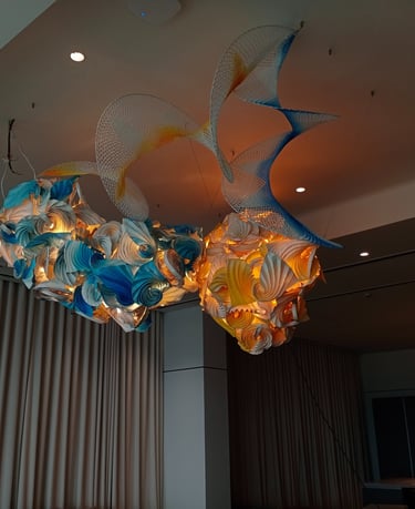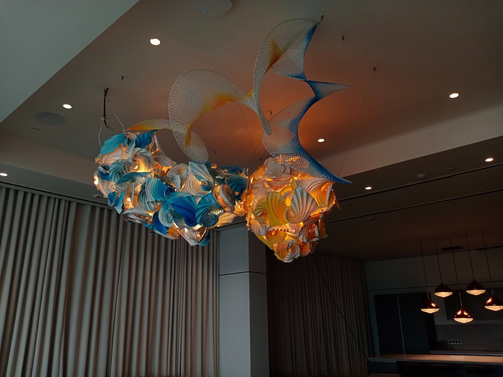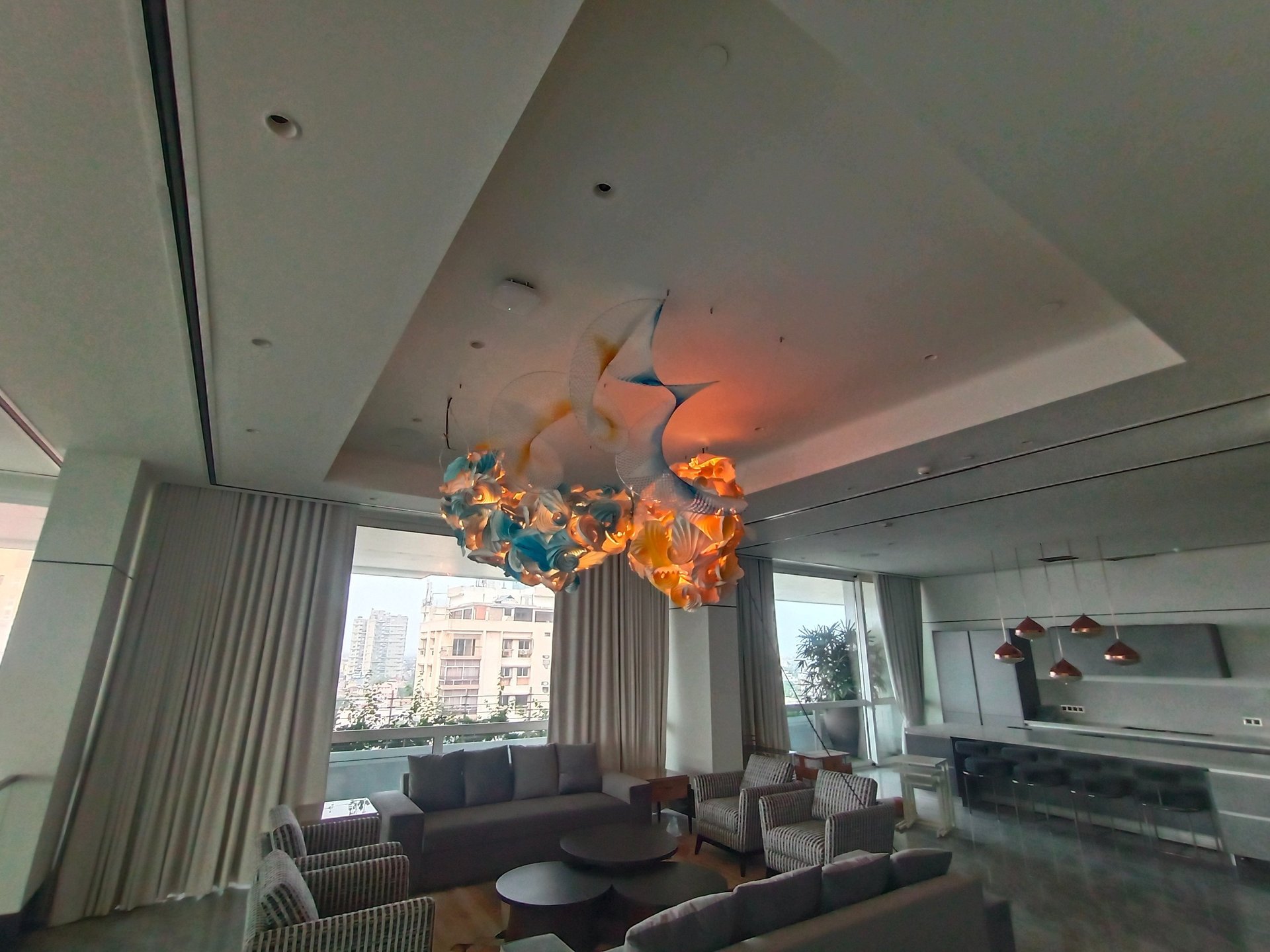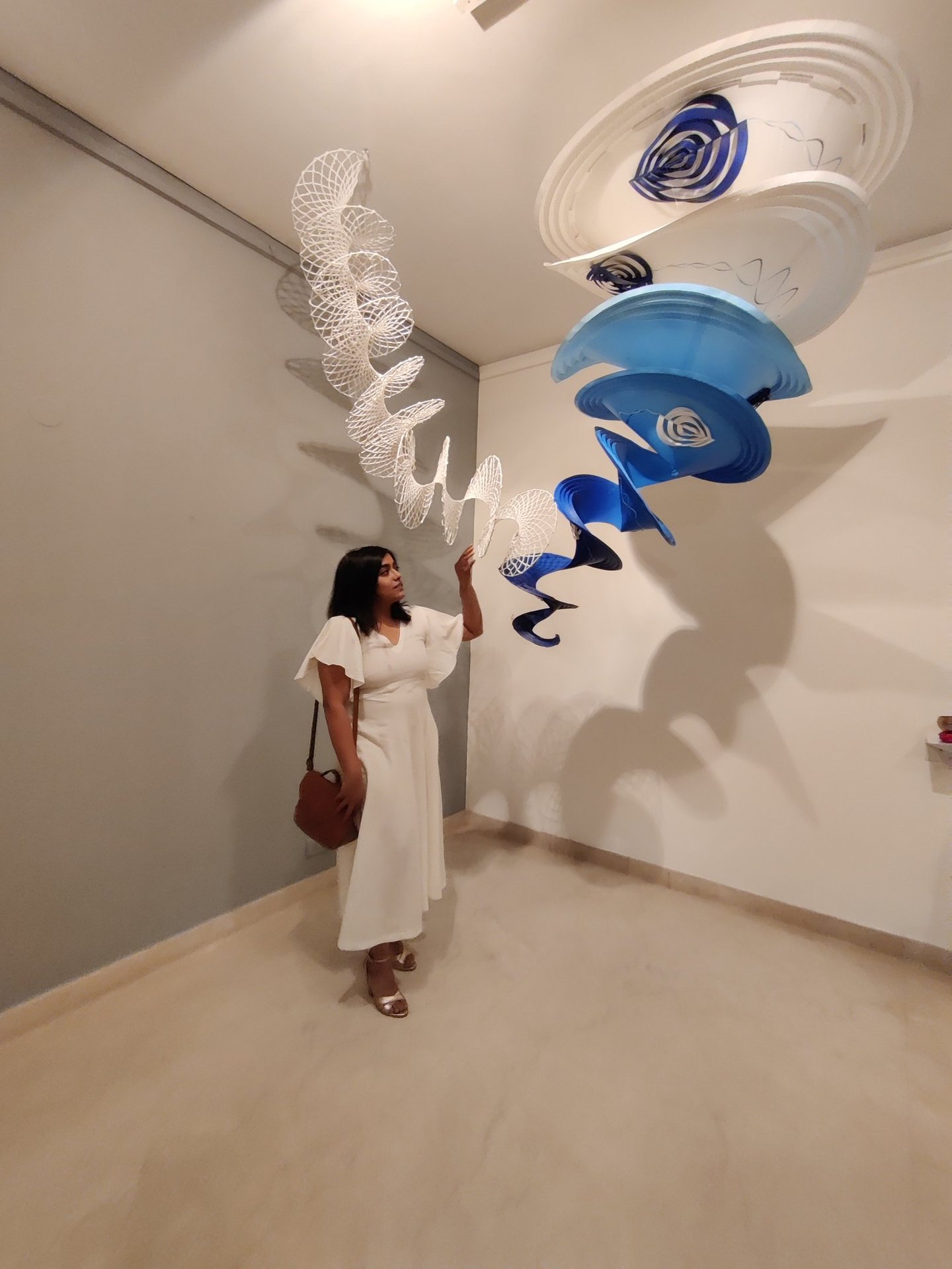 Antara has embraced the Buddhist symbol 'Unalome', which represents the journey of individual transcendence into universal consciousness. She sculpturally represents this symbol through a hand-folded and hand-painted kalmon chain origami spiral, infused with the spiritually significant color blue. This primary form is layered with lotuses, symbolizing steps towards reaching Buddha-hood, and meticulously detailed drawings reflecting the sound frequencies of the Buddhist mantra “Nam Myo Ho Ren Ge Kyo,” embodying the six steps of devotion to the mystic law of the Lotus Sutra. Together, these artists intertwine mantras from two different religious traditions, transcending religion to speak about self-growth and evolution.