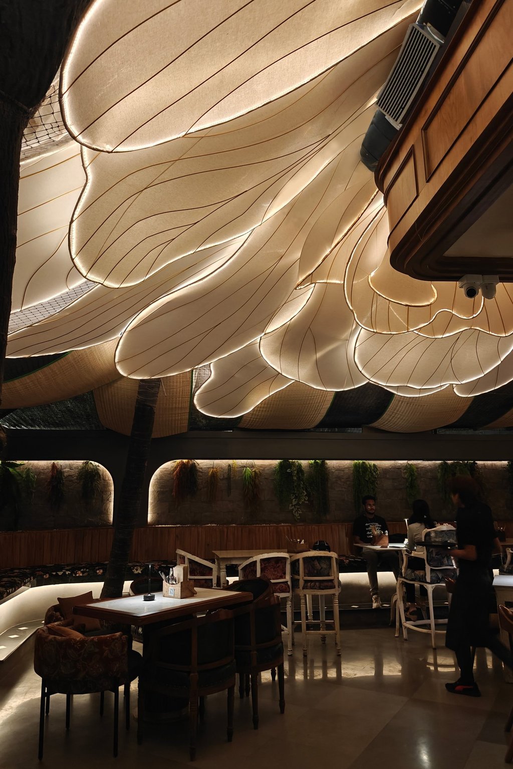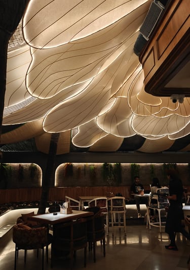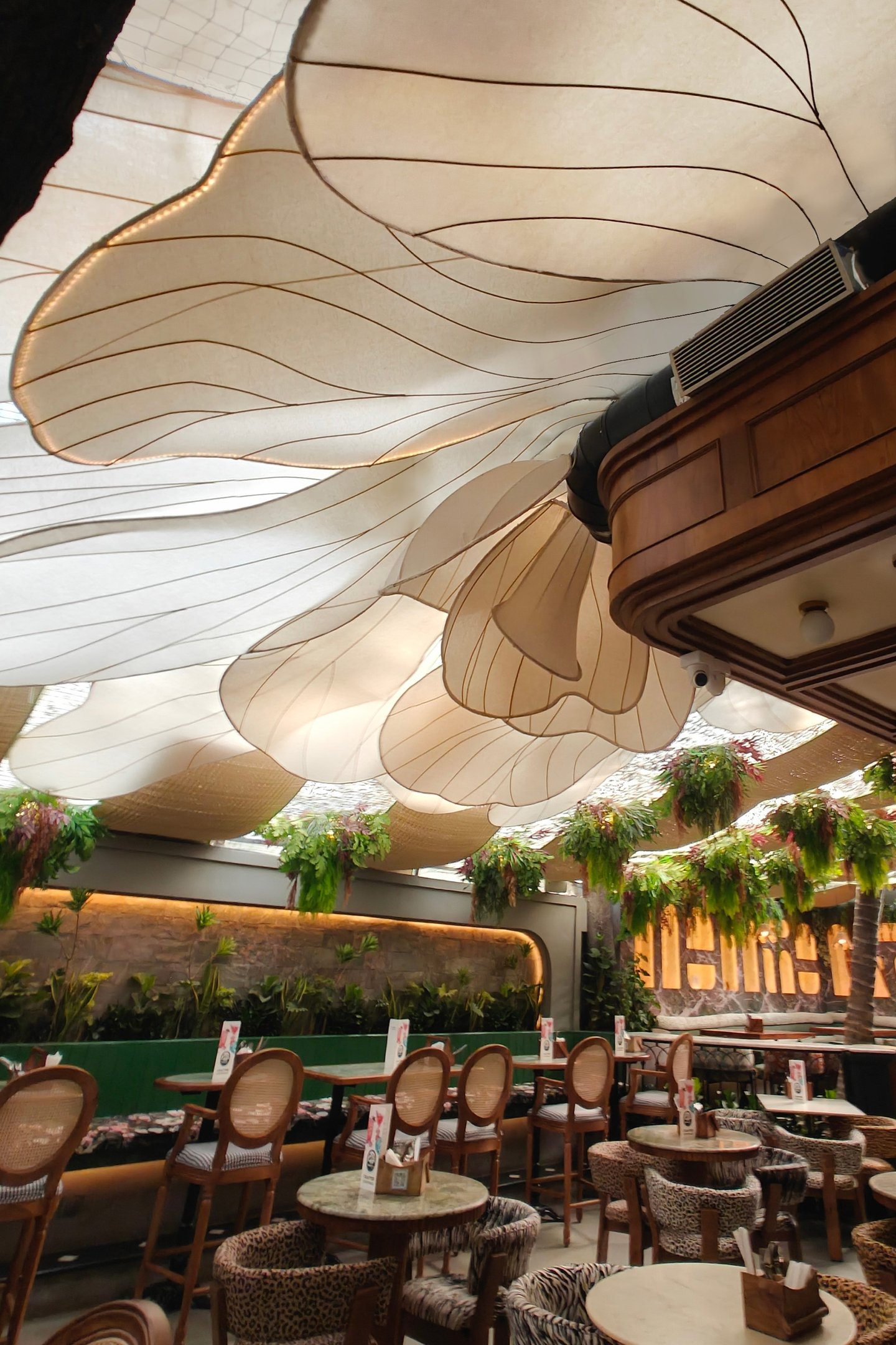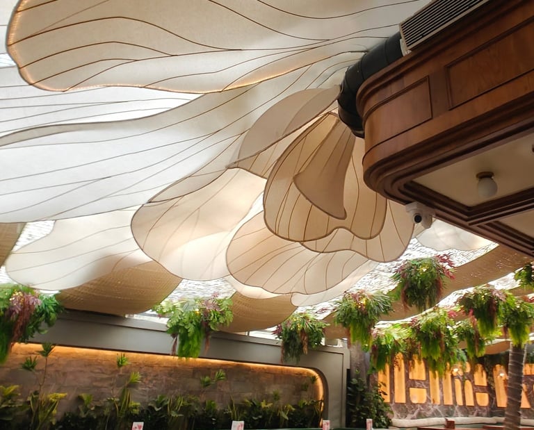 The design solution Floraison—a sculptural bloom handcrafted from metal rods & soft cotton fabric, floating above diners, glowing softly, and creating an enchanting, Instagram-worthy ambiance.