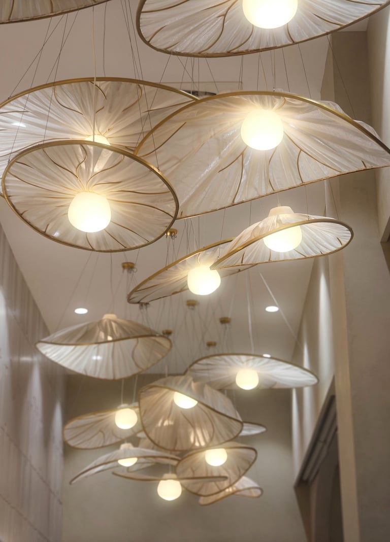 The Gossamer Foliage’ Delicate and ethereal, like a surreal dance of Luminous Leaves is a handcrafted art installation that captures the essence of nature’s quiet poetry. Composed of slender metal rods forming intricate leaf skeletons, each element is draped in simple, translucent fabric, evoking the gossamer quality of dew-kissed foliage.