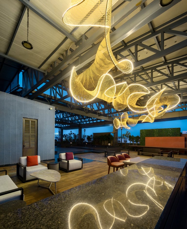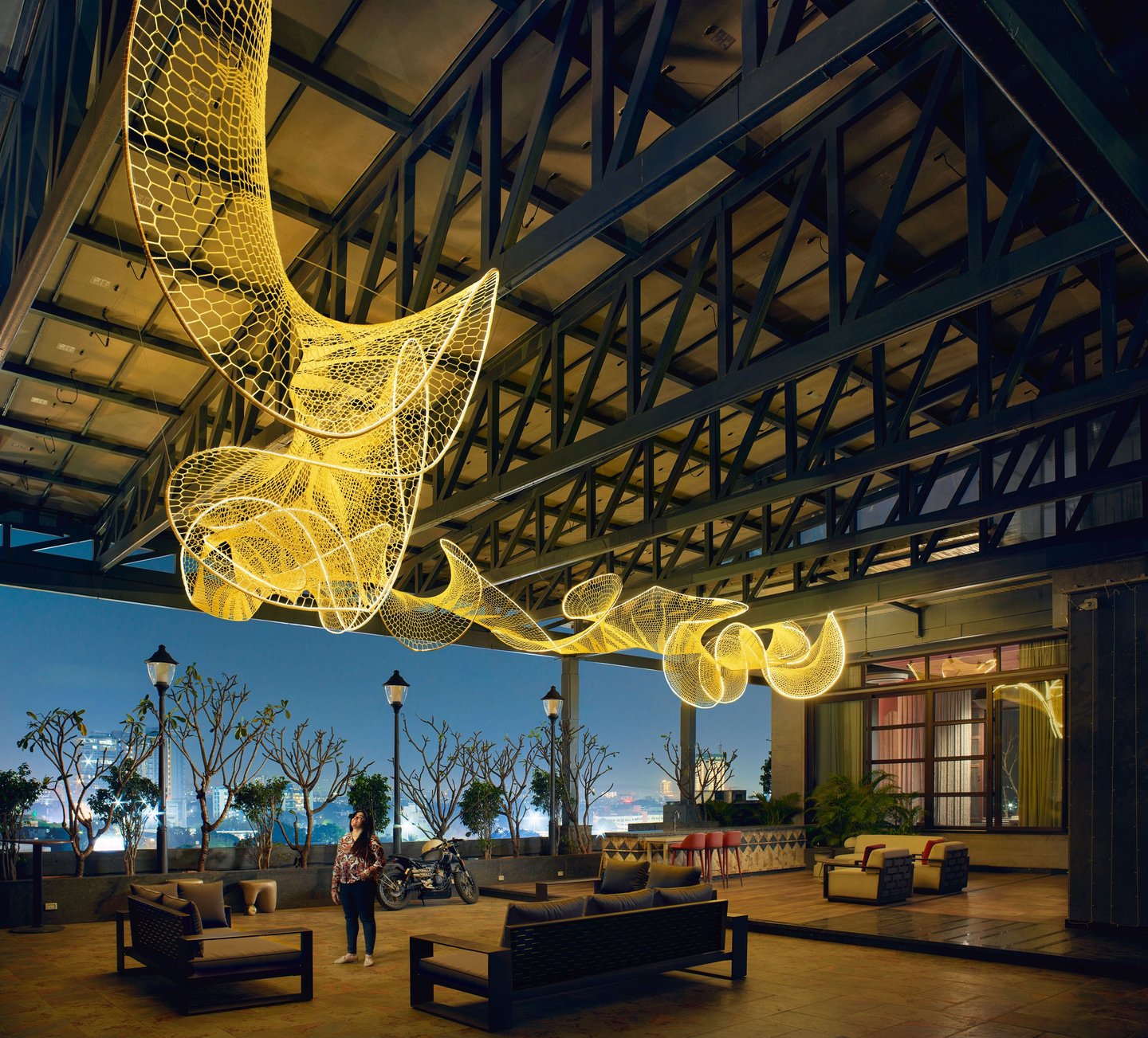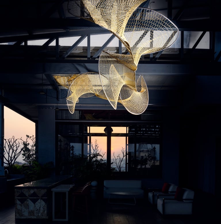 Material : M.S. Metal Frames PVD coated, polysilk threads and LED lights