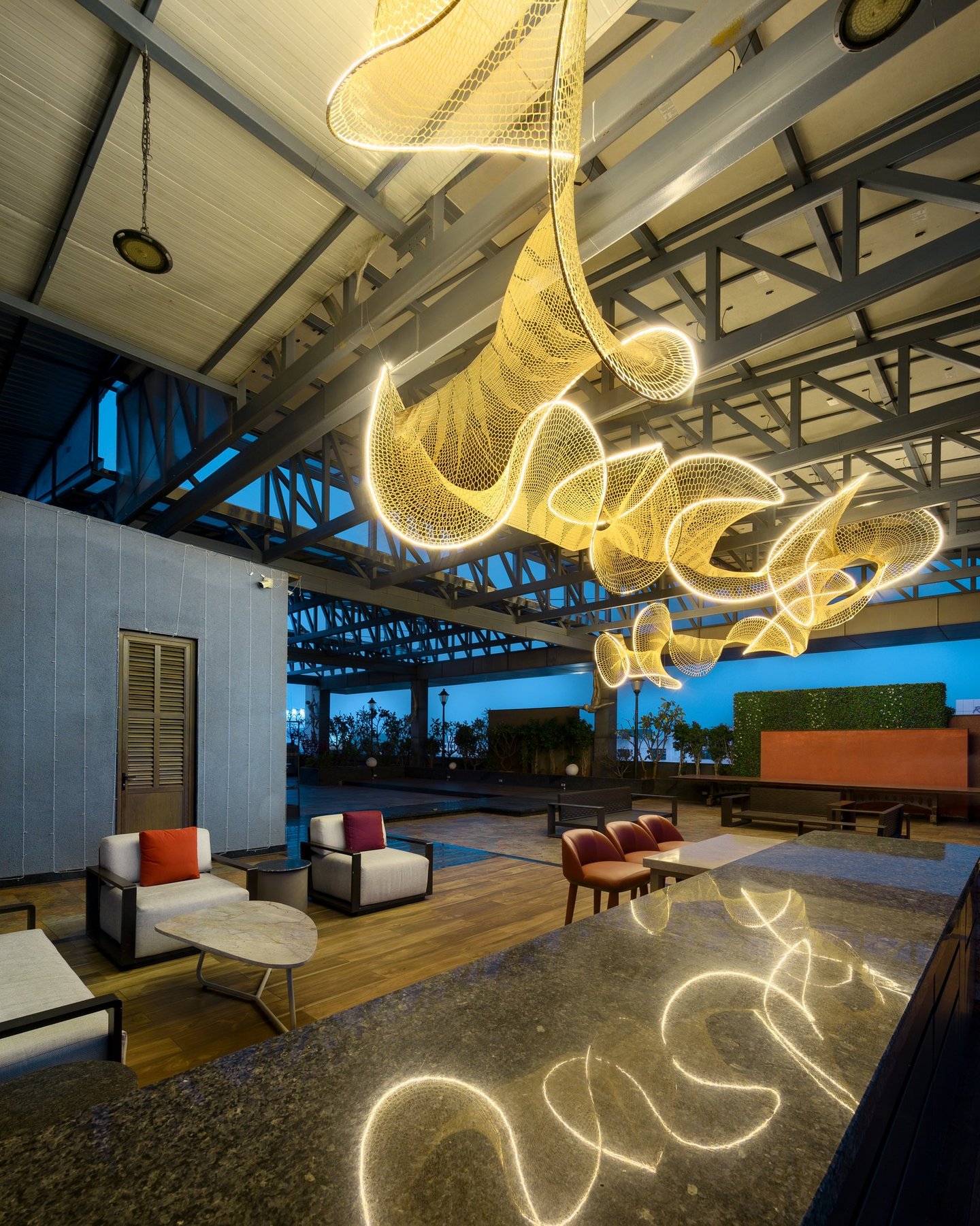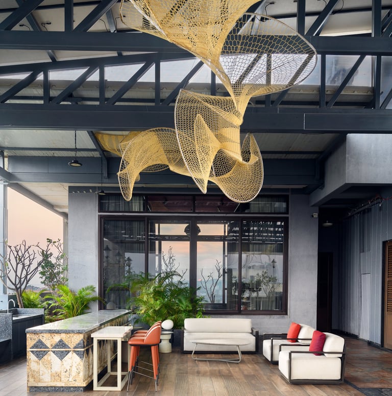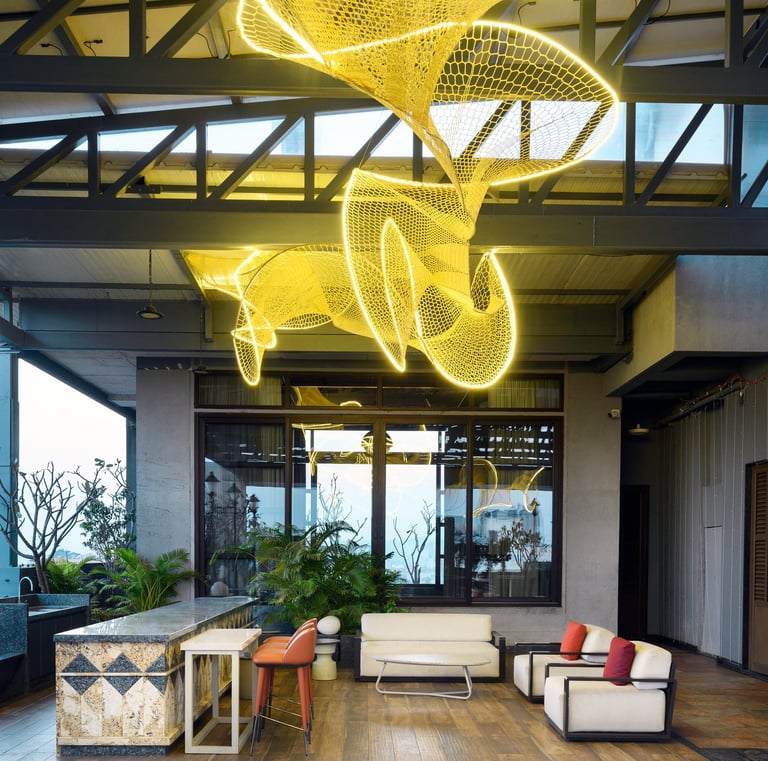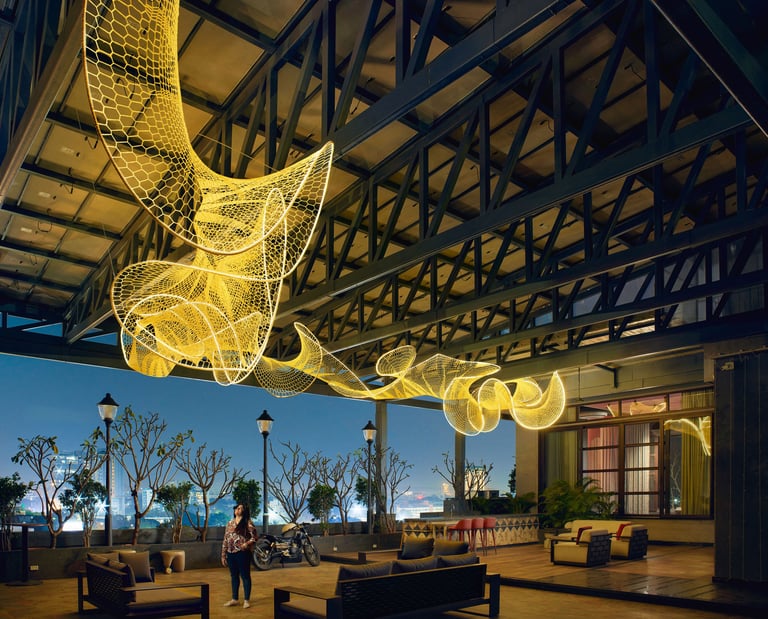 Samīrasa is a poetic celebration of the ethereal essence of wind, captured through a crocheted art installation. Crafted from polysilk threads, the installation features an intricate dance of voluptuous curves and flowing patterns, echoing the gentle, unpredictable rhythm of a breeze.